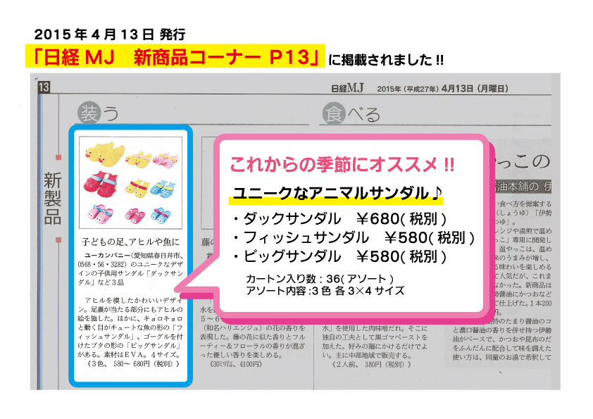 2015年4月13日発行の日経MJに弊社新商品の「サンダル」が掲載されました!!