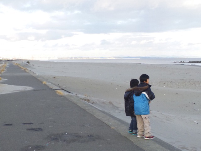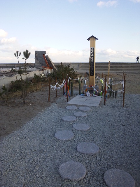 海岸手前にある慰霊塔に深々とお祈りをして、海岸線を見つめて