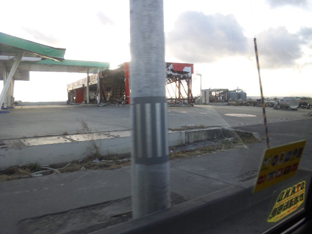 駅から30分ほど走ると、津波の影響で傾いたガソリンスタンド。